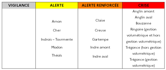 L’arrêté de restriction entre en vigueur le samedi 8 octobre 2022 à 00h et concerne les bassins versants de l’Indre listés dans le tableau suivant :
