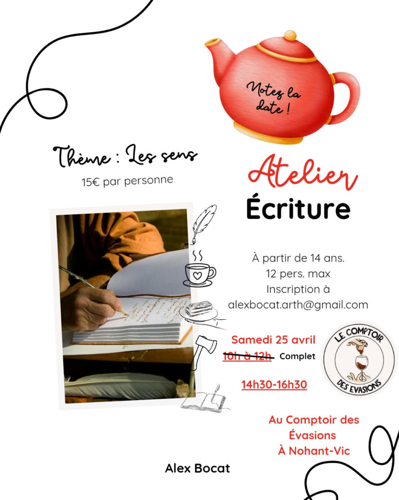 Atelier d’écriture samedi 25 avril au Comptoir des Evasions Previous Communication Nohant-Vic 17 avril 2026 Associations Partagez : Twitter Facebook