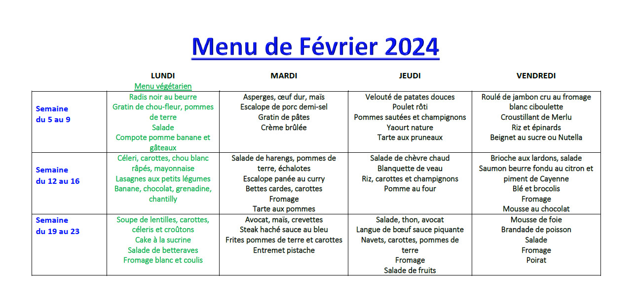 Au menu de la cantine en février Previous Next Communication Nohant-Vic 26 janvier 2024 Commune Partagez : Twitter Facebook