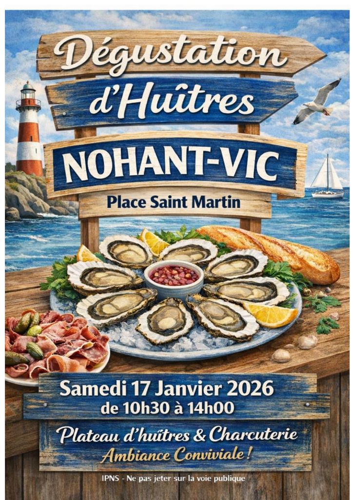 Dégustation d’huîtres samedi 17 janvier Previous Next Communication Nohant-Vic 7 janvier 2026 Associations Partagez : Twitter Facebook Le Comité des Fêtes de Nohant-Vic vous propose une dégustation d’huîtres le samedi 17 janvier. Cela se passera sur la place Saint-Martin de 10h30 à 14h00. Plateau d’huîtres et de charcuterie.