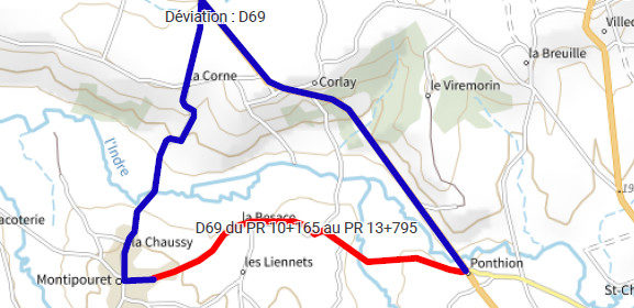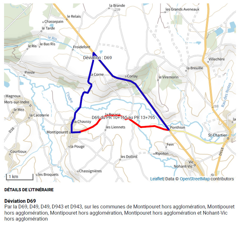 Déviation en raison de travaux sur la RD69 entre Nohant-Vic et Montipouret