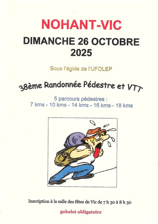 Dimanche 26 octobre randonnée pédestre et VTT Previous Communication Nohant-Vic 23 octobre 2025 Associations Partagez : Twitter Facebook