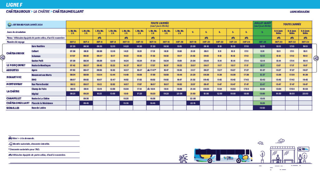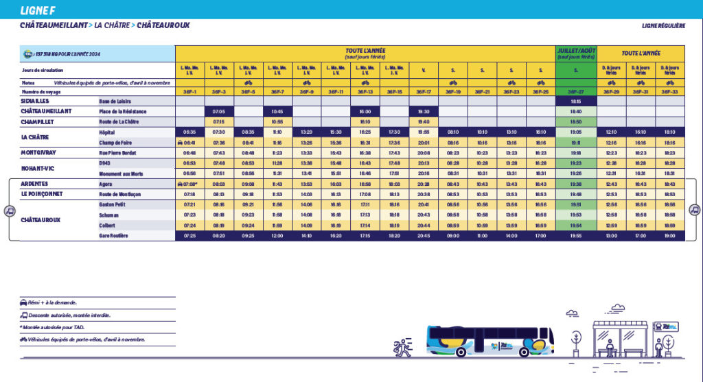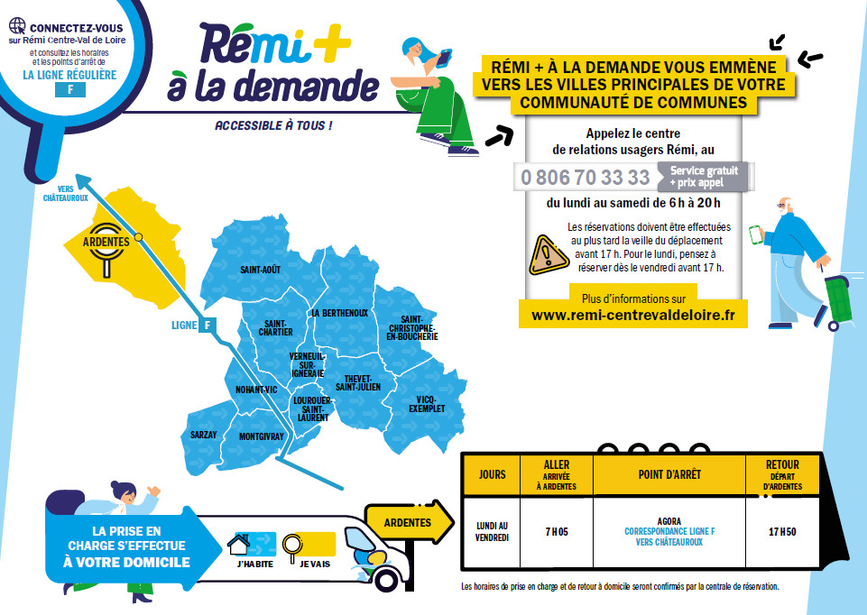 Avec Remi+ à la demande, profitez d’un transport de votre domicile jusqu’à la ligne F au point d’arrêt d’Ardentes avec du lundi au vendredi un aller au départ d’Ardentes à 7h05, puis un retour à Ardentes à 17h50.