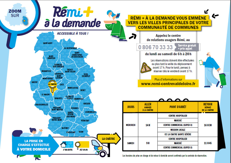 Avec Remi+ à la demande, profitez d’un transport de votre domicile jusqu’à La Châtre les mercredis et samedis.