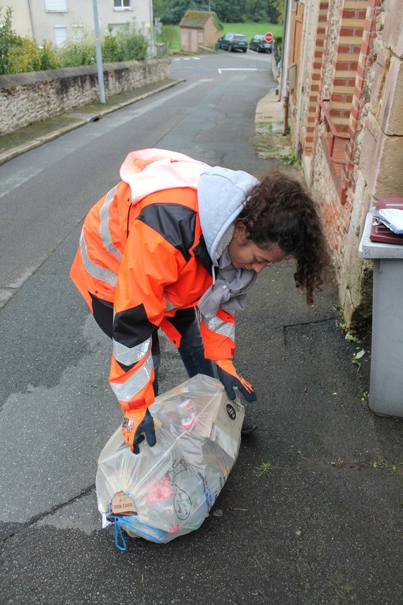 Marie, l’ambassadrice du tri du service environnement, effectue des contrôles qualités des sacs jaunes tout au long de l’année sur le territoire de la Communauté de Communes.