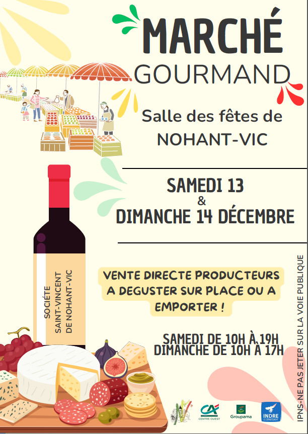 La Société de Saint-Vincent organise, à la Salle des Fêtes de NOHANT-VIC, son deuxième marché gourmand samedi 13 et dimanche 14 décembre 2025 avec dégustation et vente de vins divers, foie gras, charcuterie, huitres, fromages, chocolats, crêpes, …