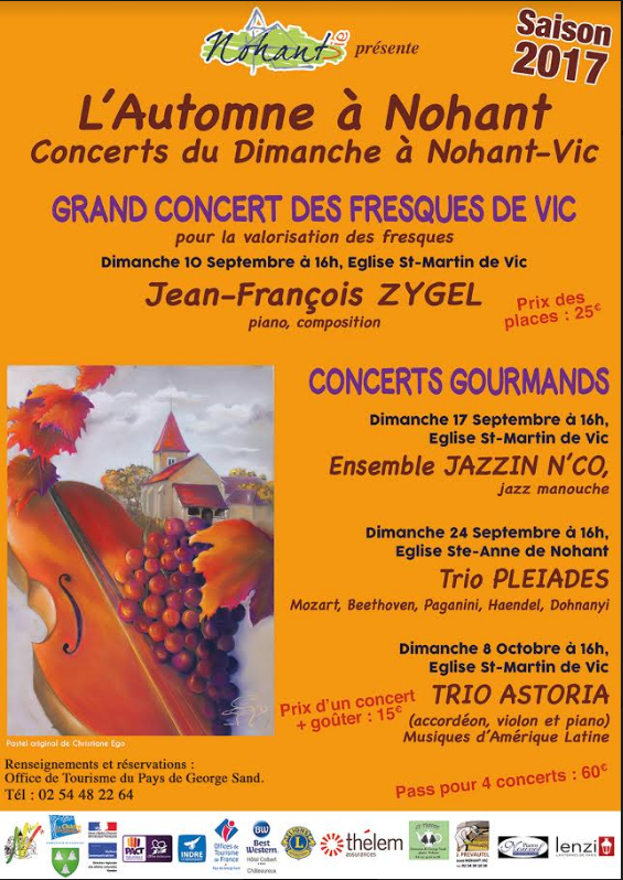 Pour sa première édition cette année, c’est Jean-François ZYGEL, pianiste, compositeur et génial improvisateur que tous les festivals et les plateaux s’arrachent qui vient manifester son soutien à “NOHANT VIE” et au fresques de Vic en proposant un évènement unique : un concert d’improvisations sur le thème des fresques de Vic.